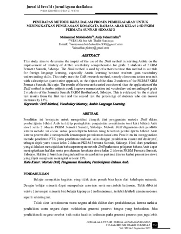 Penelitian ini bertujuan untuk mengetahui dampak dari penggunaan metode Drill dalam pembelajaran bahasa Arab terhadap peningkatan penguasaan pemahaman kosa kata bahasa Arab siswa kelas 2 ikhwan PKBM Permata Sunnah, Sidoarjo. Metode Drill digunakan oleh pendidik karena metode ini cocok untuk pembelajaran bahasa asing terutama pembelajaran bahasa Arab karena peserta didik memperoleh kemampuan pemahaman kosa kata. Penelitian ini menggunakan metode penelitian PTK yaitu penelitian tindakan kelas dengan pendekatan kuantitatif deskriptif, sebagai objek yaitu siswa kelas 2 ikhwan PKBM Permata Sunnah, Sidoarjo. Hasil dari penelitian yang dilakukan menunjukkan bahwa penerapan metode Drill pada mata pelajaran bahasa Arab dapat meningkatkaan hafalan serta pemahaman kosakata siswa kelas 2 ikhwan PKBM Permata Sunnah, Sidoarjo. Hal itu di buktikan dengan hasil tes siswa dari tes pertama dan tes kedua presentase siswa yang dapat menjawab meningkat sebesar 15%.