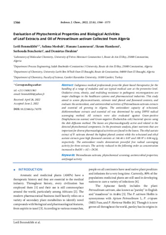 Lotfi, Benmekhbi and Salima, Mosbah and Hanane, Laamraoui and Ikram, Hamlaoui and Serhouda, Bencheriet and Demirtas, Ibrahim (2022) Evaluation of phytochemical properties and biological activities of leaf extracts and oil of Petroselinum sativum collected from Algeria. Indonesian Journal of Chemistry (Indones. J. Chem), 22 (6): 10. pp. 1566-1573. ISSN 1411-9420 e_ISSN: 2460-1578