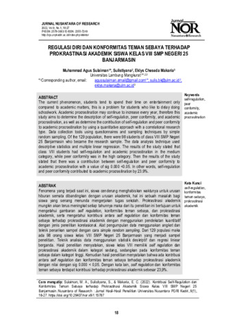 Muhammad, Agus Sulaiman and Sulistiyana, Sulistiyana and Eklys, Cheseda Makaria (2022) Regulasi diri dan konformitas teman sebaya terhadap prokrastinasi akademik siswa kelas VIII SMP Negeri 25 Banjarmasin. Nusantara of Research: Jurnal Hasil-hasil Penelitian Universitas Nusantara PGRI Kediri, 9 (1): 3. pp. 18-27. ISSN 2579-3063