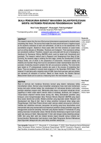 Nora, Yuniar Setyaputri and Khususiyah, Khususiyah and Putri, Ayuningtyas (2022) Skala pengukuran burnout mahasiswa dalam penyelesaian skripsi: Instrumen pendukung pengembangan “baper”. Nusantara of Research: Jurnal Hasil-hasil Penelitian Universitas Nusantara PGRI Kediri, 9 (1): 8. pp. 74-81. ISSN 2579-3063