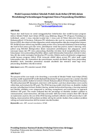 Normalia, Normalia (2023) Model layanan inklusi Sekolah Peduli Anak Hebat (SPAH) dalam Mendukung perkembangan fungsional siswa penyandang disabilitas. In: Proceeding Series of Psychology.