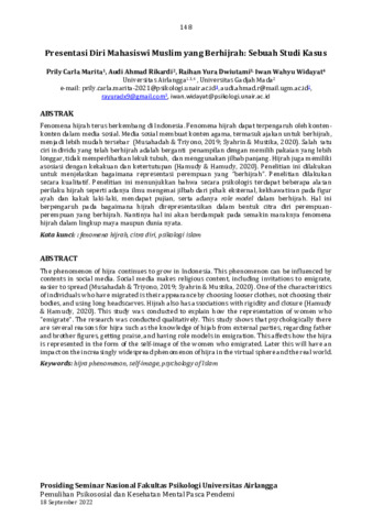 Prily, Carla Marita and Audi, Ahmad Rikardi and Raihan, Yura Dwiutami and Iwan, Wahyu Widayat (2023) Presentasi diri mahasiswi muslim yang berhijrah: Sebuah studi kasus. In: Proceeding Series of Psychology.