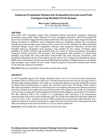 Ritna, Sandri and Dellawaty, Supraba (2023) Kepuasan pernikahan ditinjau dari komunikasi interpersonal pada pasangan yang menikah di usia remaja. In: Proceeding Series of Psychology.