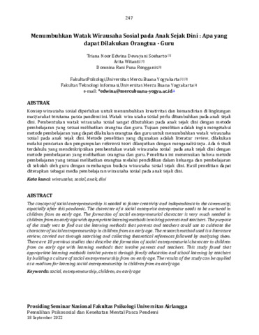Triana, Noor Edwina Dewayani Soeharto and Arita, Witanti and Domnina, Rani Puna Rengganis (2023) Menumbuhkan watak wirausaha sosial pada anak sejak dini : Apa yang dapat dilakukan orangtua - guru. In: Proceeding Series of Psychology.