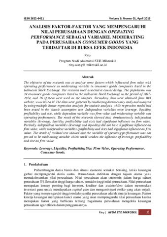 Riny, Riny (2019) Analisis faktor-faktor yang mempengaruhi nilai perusahaan dengan operating performance sebagai variabel moderating pada perusahaan consumer goods yang terdaftar di Bursa Efek Indonesia. Jurnal Wira Ekonomi Mikroskil : JWEM, 9 (1): 3. pp. 21-32. ISSN 2088-9607