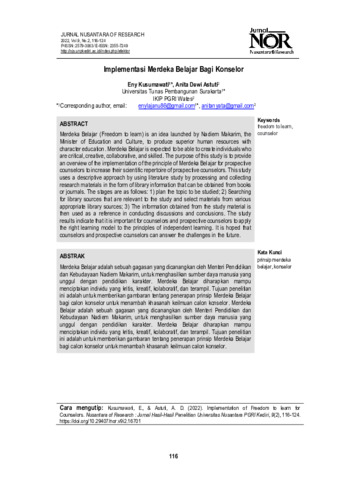 Eny, Kusumawati and Anita, Dewi Astuti (2022) Implementasi merdeka belajar bagi konselor. Nusantara of Research: Jurnal Hasil-hasil Penelitian Universitas Nusantara PGRI Kediri, 9 (2): 3. pp. 116-124. ISSN 2579-3063