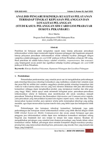 Martha, Dewi (2019) Analisis pengaruh kinerja kualitas pelayanan terhadap tingkat kepuasan pelanggan dan loyalitas pelanggan (studi kasus: pelanggan sim card GSM prabayar di Kota Pekanbaru). Jurnal Wira Ekonomi Mikroskil : JWEM, 9 (1): 6. pp. 55-62. ISSN 2088-9607