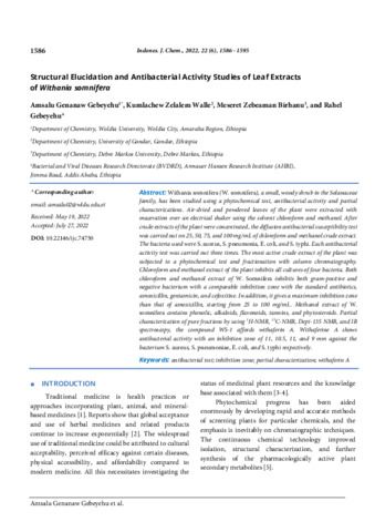 Amsalu Genanaw, Gebeyehu and Kumlachew Zelalem, Walle and Meseret Zebeaman, Birhanu and Rahel, Gebeyehu (2022) Structural elucidation and antibacterial activity studies of leaf extracts of Withania somnifera. Indonesian Journal of Chemistry (Indones. J. Chem), 22 (6): 12. pp. 1586-1595. ISSN 1411-9420 e_ISSN: 2460-1578