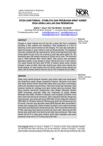 Mudhar, Mudhar and Aisyah, Aisyah and Elia, Firda Mufidah and Dwi, Nastiti (2022) Studi longitudinal: Stabilitas dan perubahan minat karier pada siswa laki-laki dan perempuan. Nusantara of Research: Jurnal Hasil-hasil Penelitian Universitas Nusantara PGRI Kediri, 9 (2): 7. pp. 162-176. ISSN 2579-3063