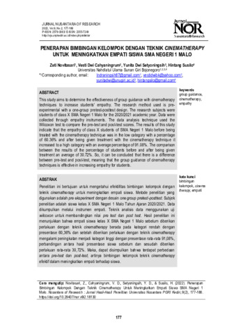 Zeti, Novitasari and Vesti, Dwi Cahyaningrum and Yunita, Dwi Setyoningsih and Hintang, Susilo (2022) Penerapan bimbingan kelompok dengan teknik cinema therapy untuk meningkatkan empati siswa SMA Negeri 1 Malo. Nusantara of Research: Jurnal Hasil-hasil Penelitian Universitas Nusantara PGRI Kediri, 9 (2): 8. pp. 177-186. ISSN 2579-3063