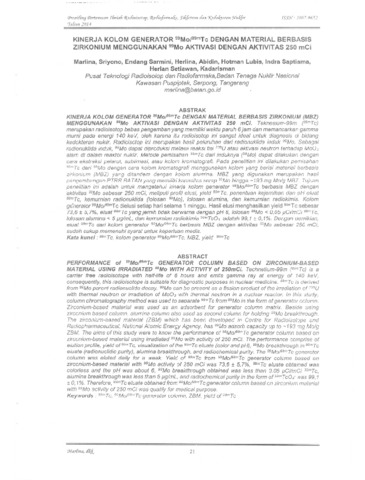 Teknesium-99m (99mTc) merupakan radioisotop bebas pengembangan yang memiliki waktu paruh 6 jam dan memancarkan gamma mumi pada energi 140 keV, oleh karena itu radioisotop ini sangat ideal untuk diagnosis di bidang kedokteran nuklir. Radioisotop ini merupakan hasil peluruhan dari radionuklida induk 99Mo. Sebagai radionuklida induk, 99Mo dapat diproduksi melalui reaksi fisi 235U atau aktivasi neutron terhadap M003 alam di dalam reaktor nuklir. Metode pemisahan 99mTc dari induknya (99Mo) dapat dilakukan dengan cara ekstraksi pelarut, sublimasi, atau kolom kromatografi. Pada penelitian ini dilakukan pemisahan 99mTc dari 99Mo dengan cara kolom kromatografi menggunakan kolom yang berisi material berbasis zirkonium (MBZ) yang ditandem dengan kolom alumina. MBZ yang digunakan merupakan hasil pengembangan PTRR BATAN yang memiliki kapasitas serap 99Mo hingga -193 mg Mo/g MBZ. Tujuan penelitian ini adalah untuk mengetahui kinerja kolom generator 99Mo/99mTc berbasis MBZ dengan aktivitas 99Mo sebesar 250 mCi, meliputi profit elusi, yield 99mTc, penentuan kejernihan dan pH eluat 99mTc,kemurnian radionuklida (lolosan 99Mo), lolosan alumina, dan kemurnian radiokimia. Kolom generator 99Mo; 99mTc dielusi setiap hari selama 1 minggu. Hasil elusi menghasilkan yield 99mTc sebesar 73,6 ± 5,7%, eluat 99mTc yang jernih tidak berwarna dengan pH 6, lolosan 99Mo < 0,05 uCi/mCi 99mTc, lolosan alumina < 5 ug/mL, dan kemumian radiokimia 99mTc04' adalah 99,1 ± 0,1%. Dengan demikian, eluat 99mTc dari kolom generator 99Mo/99mTc berbasis MBZ dengan aktivitas 99Mo sebesar 250 mCi, sudah cukup memenuhi syarat untuk keperluan medis.