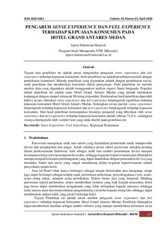 Hutasoit, Apren Halomoan (2020) Pengaruh sense experience dan feel experience terhadap kepuasan konsumen pada Hotel Grand Antares Medan. Jurnal Wira Ekonomi Mikroskil : JWEM, 10 (1): 2. pp. 13-20. ISSN 2088-9607