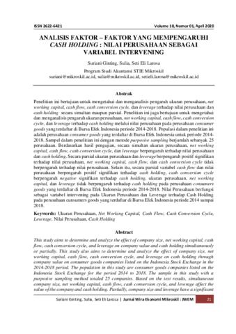 Ginting, Suriani and Sulia, Sulia and Larosa, Seti Eli (2020) Analisis faktor-faktor yang mempengaruhi cash holding : nilai perusahaan sebagai variabel intervening. Jurnal Wira Ekonomi Mikroskil : JWEM, 10 (1): 3. pp. 21-32. ISSN 2088-9607