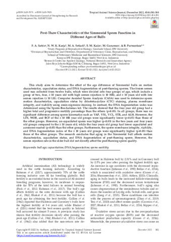 F., A. Satrio and N., W. K. Karja and M., A. Setiadi and E., M. Kaiin and M., Gunawan and B., Purwantara (2022) Post-thaw characteristics of the simmental sperm function in different ages of bulls. Tropical Animal Science Journal, 45 (4): 1. pp. 381-388. ISSN 2615-787X