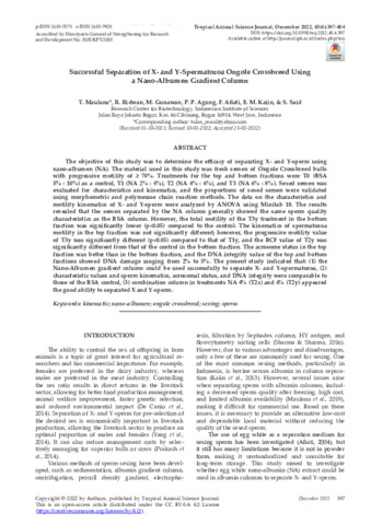 T., Maulana and R., Ridwan and M., Gunawan and P., P. Agung and F., Afiati and E., M. Kaiin and S., Said (2022) Successful separation of x- and y-spermatozoa ongole crossbreed using a nano-albumen gradient column. Tropical Animal Science Journal, 45 (4): 3. pp. 397-404. ISSN 2615-787X
