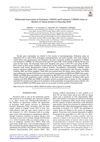 Santoso, Santoso and A., Gunawan and C., Sumantri and R., I. Arifiantini and Herdis, Herdis (2022) Differential expressions of protamine 1 (PRM1) and protamine 2 (PRM2) genes as markers of semen quality in Pasundan bulls. Tropical Animal Science Journal, 45 (4): 6. pp. 423-428. ISSN 2615-787X