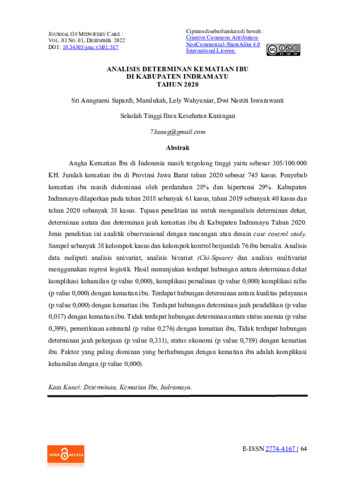 Sri Anugraeni, Supardi and Mamlukah, Mamlukah and Lely, Wahyuniar and Dwi Nastiti, Iswarawanti (2022) Analisis determinan kematian ibu di Kabupaten Indramayu tahun 2020. Journal of Midwifery Care, 3 (1): 6. pp. 64-74. ISSN 2774-4167