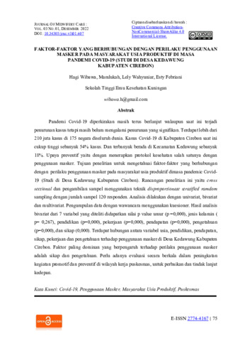 Hagi, Wibawa and Mamlukah, Mamlukah and Lely, Wahyuniar and Esty, Febriani (2022) Faktor-faktor yang berhubungan dengan perilaku penggunaan masker pada masyarakat usia produktif di masa pandemi covid-19 (studi di desa Kedawung Kabupaten Cirebon). Journal of Midwifery Care, 3 (1): 7. pp. 75-85. ISSN 2774-4167