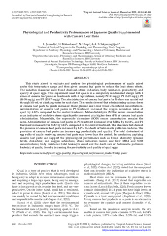 L., Jumadin and H., Maheshwari and N., Ulupi and A., S. Satyaningtijas (2022) Physiological and productivity performances of Japanese quails supplemented with cassava leaf paste. Tropical Animal Science Journal, 45 (4): 11. pp. 460-466. ISSN 2615-787X