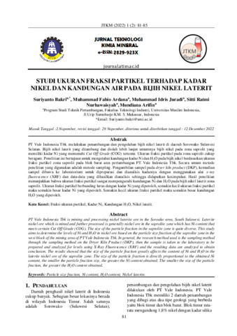 Suriyanto, Bakri and Muhammad, Fabio Ardana and Muhammad, Idris Juradi and Sitti, Ratmi Nurhawaisyah and Mundiana, Arifin (2022) Studi ukuran fraksi partikel terhadap kadar nikel dan kandungan air pada bijih nikel laterit. Jurnal Teknologi Kimia Mineral, 1 (2): 8. pp. 81-85. ISSN 2829-923X