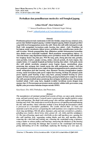Adhan, Efendi and Roni, Suhartono (2019) Perbaikan dan pemeliharaan mesin disc mill bongkol jagung. Jurnal Mesin Nusantara, 2 (1): 6. pp. 42-51. ISSN 2775-7390