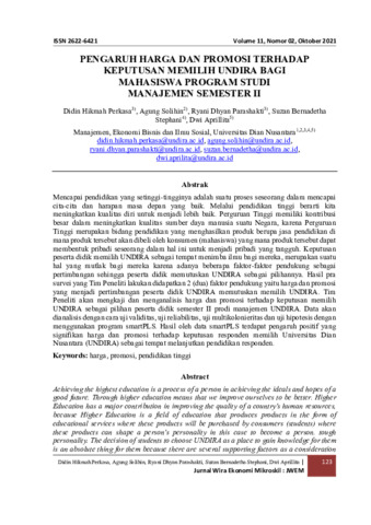 Didin, Hikmah Perkasa and Agung, Solihin and Ryani, Dhyan Parashakti and Suzan, Bernadetha Stephani and Dwi, Aprillita (2021) Pengaruh harga dan promosi terhadap keputusan memilih Undira bagi mahasiswa program studi manajemen semester ii. Jurnal Wira Ekonomi Mikroskil : JWEM, 11 (2): 6. pp. 123-136. ISSN 2088-9607