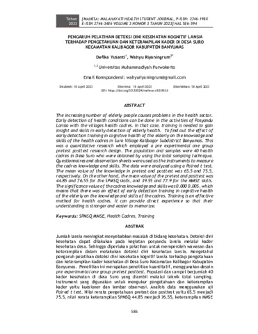 Defika, Yusanti and Wahyu, Riyaningrum (2023) Pengaruh pelatihan deteksi dini kesehatan kognitif lansia terhadap pengetahuan dan keterampilan kader di Desa Suro Kecamatan Kalibagor Kabupaten Banyumas. MAHESA : Malahayati Health Student Journal, 3 (3): 2. pp. 586-594. ISSN 2746-198X