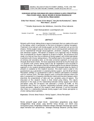 Erika, Putri Halawa and Hotma, Uli Br Manalu and Devi, Novita Rumahorbo and Idama, Wati Nduru and Sunarti, Sunarti (2023) Hubungan antara dukungan keluarga dengan illness perception pada pasien gagal ginjal kronik di ruang hemodialisa di RSU Royal Prima Medan. MAHESA : Malahayati Health Student Journal, 3 (3): 4. pp. 605-621. ISSN 2746-198X