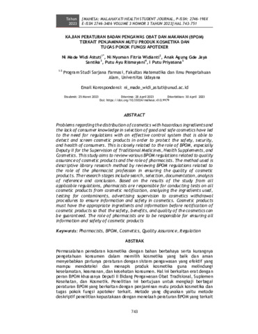 Ni Made, Widi Astuti and Ni Nyoman, Widianti Fitria and Anak Agung, Gde Jaya Santika and Putu Ayu, Rismayani and I Putu, Priyasana (2023) Kajian peraturan Badan Pengawas Obat Dan Makanan (BPOM) terkait penjaminan mutu produk kosmetika dan tugas pokok fungsi apoteker. MAHESA : Malahayati Health Student Journal, 3 (3): 15. pp. 743-751. ISSN 2746-198X