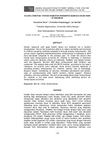Fiorentina, Nova and Fransiska, Ompusunggu and Lia, Kartika (2023) Kajian literatur: Faktor hambatan penerapan imunisasi dasar anak di Indonesia. MAHESA : Malahayati Health Student Journal, 3 (3): 18. pp. 770-788. ISSN 2746-198X