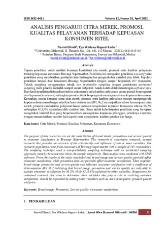 Nasrul, Efendi and Tya, Wildana Hapsari Lubis (2022) Analisis pengaruh citra merek, promosi, kualitas pelayanan terhadap kepuasan konsumen ritel. Jurnal Wira Ekonomi Mikroskil : JWEM, 12 (1): 3. pp. 21-36. ISSN 2088-9607