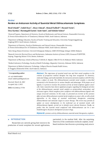 Rizal, Irfandi and Indah, Raya and Ahyar, Ahmad and Ahmad, Fudholi and Hasnah, Natsir and Desy, Kartina and Harningsih, Karim and Santi, Santi and Subakir, Salnus (2022) Review on anticancer activity of essential metal dithiocarbamate complexes. Indonesian Journal of Chemistry (Indones. J. Chem), 22 (6): 23. pp. 1722-1736. ISSN 1411-9420 e_ISSN: 2460-1578