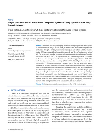 Winda, Rahmalia and Anis, Shofiyani and Yohana Sutiknyawati Kusuma, Dewi and Septiani, Septiani (2022) Simple green routes for metal-bixin complexes synthesis using glycerol-based deep eutectic solvent. Indonesian Journal of Chemistry (Indones. J. Chem), 22 (6): 25. pp. 1759-1767. ISSN 1411-9420 e_ISSN: 2460-1578