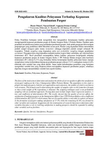 Pelawi, Pioner and Efendi, Nasrul and Ginting, Sugianta Ovinus (2022) Pengukuran kualitas pelayanan terhadap kepuasan pembuatan paspor. Jurnal Wira Ekonomi Mikroskil : JWEM, 12 (2): 4. pp. 91-104. ISSN 2088-9607