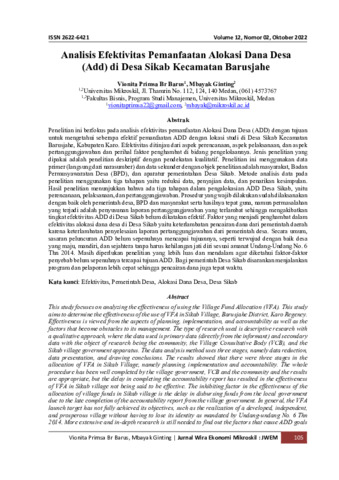 Vionita, Primsa Br Barus and Mbayak, Ginting (2022) Analisis efektivitas pemanfaatan alokasi dana desa (ADD) di Desa Sikab Kecamatan Barusjahe. Jurnal Wira Ekonomi Mikroskil : JWEM, 12 (2): 5. pp. 105-114. ISSN 2088-9607
