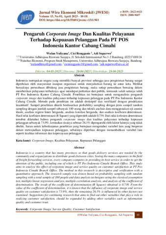 Wulan, Yuliyana and Cici, Rengganis and Adi, Suparwo (2023) Pengaruh corporate image dan kualitas pelayanan terhadap kepuasan pelanggan pada PT POS Indonesia Kantor Cabang Cimahi. Jurnal Wira Ekonomi Mikroskil : JWEM, 13 (1): 2. pp. 10-18. ISSN 2088-9607