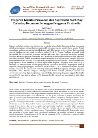 Suci, Pertiwi (2023) Pengaruh kualitas pelayanan dan experiental marketing terhadap kepuasan pelanggan pengguna Firstmedia. Jurnal Wira Ekonomi Mikroskil : JWEM, 13 (1): 9. pp. 92-99. ISSN 2088-9607