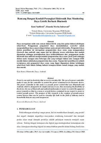Kuni, Nadliroh and Elsanda, Merita Indrawati (2019) Rancang bangun kendali perangkat elektronik dan monitoring daya listrik berbasis bluetooth. Jurnal Mesin Nusantara, 2 (2): 3. pp. 81-88. ISSN 2775-7390