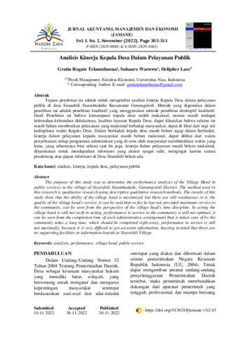 Gratia, Rogate Telaumbanua and Sukaaro, Waruwu and Delipiter, Lase (2022) Analisis kinerja kepala desa dalam pelayanan publik. Jurnal Akuntansi, Manajemen dan Ekonomi (Jamane), 1 (2): 15. pp. 303-311. ISSN 2829-8888