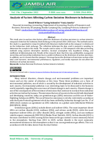 Rendi, Wibowo and Saring, Suhendro and Yunia, Amelia (2022) Analysis of factors affecting carbon emission disclosure in Indonesia. Journal of Accounting Management Business and International Research, 1 (1): 1. pp. 1-16. ISSN 2964-0954