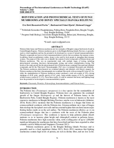 Eva, Dewi Rosmawati Purba and Rachmawati, Felani Djuria and Rahmad, Lingga (2022) Identification and photochemical tests of fungi mushrooms and honey specially Bangka Belitung. In: The International Conference on Health Technology.