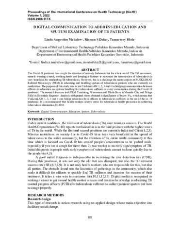 Linda, Augustien Makalew and Risman, S Duka and Tumartony, Hiola (2022) Digital communication to address education and sputum examination of tb patients. In: The International Conference on Health Technology.