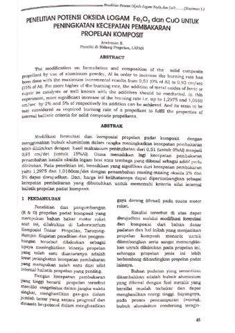 Modifikasi formulasi dan komposisi propelan padat komposit dengan menggunakan bubuk aluminium dalam rangka meningkatkan kecepatan perbalaran telah dilaloukan dengan hasil maicsimum peningkatan dari 0,51 (untuk O°6AJ) menjadi 0,93 cm/det (untuk 15%Al). Guna menailkan lagi kecepatan pembakaran penambahan katalis olsida logam besi atau tembaga yang dikenal sebagai aditil perl dilakukan. Pada penelitian ini, kenailkan yang signifikan dari kecepatan pembakaran yaitu 1,2975 dan 1,0160cm/det dengan penambahan masing-masing olcida 2% dan 5% dapat diwujudkan. Dan, harga ini kelihatannya dapat dipertimbangkan sebagai kecepatan pembakaran yang dibutuhkan untuk memenuhi kriteria sifat internal balistik propelan padat komposit