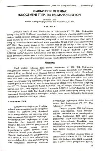 Hasil analisis sebaran debu Pabrik Indocement PT ITP. Tbk Palimanan menggunalan metode SEM, X-RD maupun kimia secara kuantitatif dan kualitatif, menunjuldan partikulat yang dibuang melalai crobong adalah clinker. Kontribusi dinker yang dilempar kecil (0,91% dari total yang terukur) jia dibandingkan dengan debu dari scktanya yang dibawa olch truk pengangkut semen dan bahan batu atau tanah pengurugan yang disampling dengan filter HVS. Daersh Gua Macan di sebelai selatan pabrik adalah daerah yang terkena lemparan plume (debu dari stack) langsung dari PT ITP, Secara kuantitatif hanya 0,0029211 mg/m° dengan diameter 10 pm ke bawah, dan 0,0001911 mg/m° diameter 1 jim serta 0,002912 mg/m° diameter 0,3 jam semuanya di bawah NAB. Dari hasil analisis kimia unsur clinker yang paling banyak terdapat di daerah Gua Macan sedangian sebelah timur unsur CaO paling tinggi yang berasal dari pembakaran kapur rakyat.