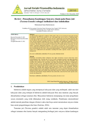 Muhammad, Imam Badruttamam (2022) Review: pemanfaatan kandungan senyawa alami pada daun jati (Tectona grandis) sebagai antibakteri dan antioksidan. Jurnal Ilmiah Fitomedika Indonesia, 1 (1): 2. pp. 8-18. ISSN 2985-7414