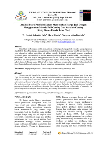 Tri, Hartati Sukartini Hulu and Idarni, Harefa and Nanny, Artatina Bu’ulolo (2022) Analisis biaya produksi dalam menentukan harga jual dengan menggunakan metode full costing dan variable costing (Study kasus pabrik tahu Nias). Jurnal Akuntansi, Manajemen dan Ekonomi (Jamane), 1 (2): 22. pp. 358-362. ISSN 2829-8888