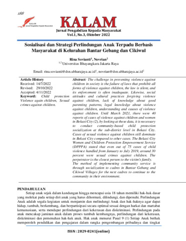 Rina, Sovianti and Novrian, Novrian (2022) Sosialisasi dan strategi perlindungan anak terpadu berbasis masyarakat di Kelurahan Bantar Gebang dan Cikiwul. Jurnal Pengabdian Kepada Masyarakat Kalam, 1 (3): 9. pp. 188-193. ISSN 2829-8241