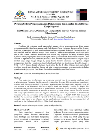 Yoel, Melsaro Larosa and Otanius, Laia and Odaligoziduhu, halawa and Wahyutra, Adilman Telaumbanua (2022) Peranan sistem pengorganisasian dalam upaya peningkatan produktivitas kerja pegawai. Jurnal Akuntansi, Manajemen dan Ekonomi (Jamane), 1 (2): 23. pp. 363-367. ISSN 2829-8888