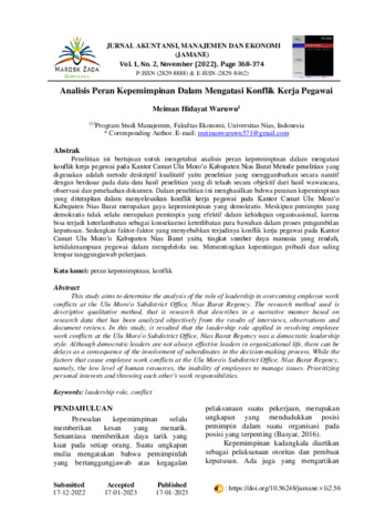 Meiman, Hidayat Waruwu (2022) Analisis peran kepemimpinan dalam mengatasi konflik kerja pegawai. Jurnal Akuntansi, Manajemen dan Ekonomi (Jamane), 1 (2): 24. pp. 368-374. ISSN 2829-8888