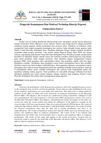 Odaligoziduhu, Halawa (2022) Pengaruh kemampuan dan motivasi terhadap kinerja pegawai. Jurnal Akuntansi, Manajemen dan Ekonomi (Jamane), 1 (2): 25. pp. 375-381. ISSN 2829-8888